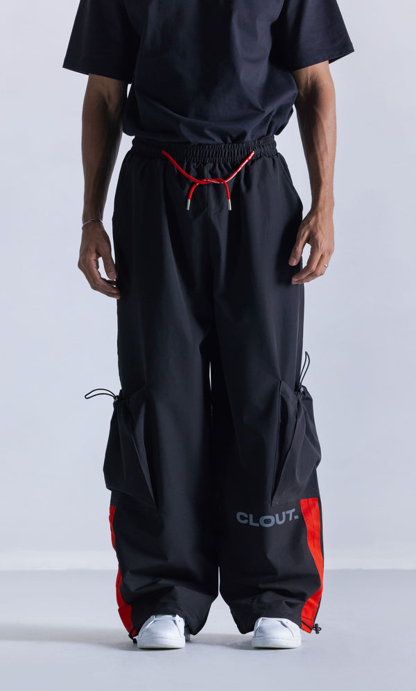 Introducing new loose fit trousers in polyester with covered elastication and a drawcord at the waist and drawstrings at the hem. Diagonal pockets front pockets and 2 cargo pockets at the sides.