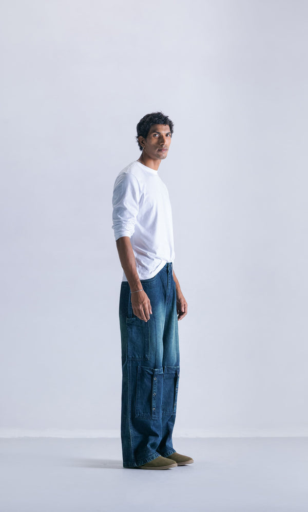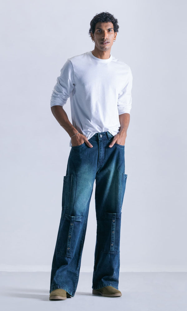 Characterized by its artful fading, exaggerated pockets, and utilitarian detailing, this pair is as functional as it is fashionable. Designed for the discerning modern man, the jeans offer superior comfort without compromising on structure. The mid-rise waistband sits naturally, while the wide-leg cut drapes elegantly, making it a versatile addition to both casual and elevated wardrobes.