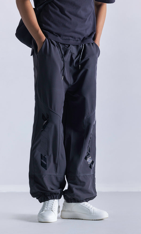 Introducing new loose fit trousers in polyester with covered elastication and a drawcord at the waist and drawstrings at the hem. Diagonal pockets front pockets and flap pockets at the back.