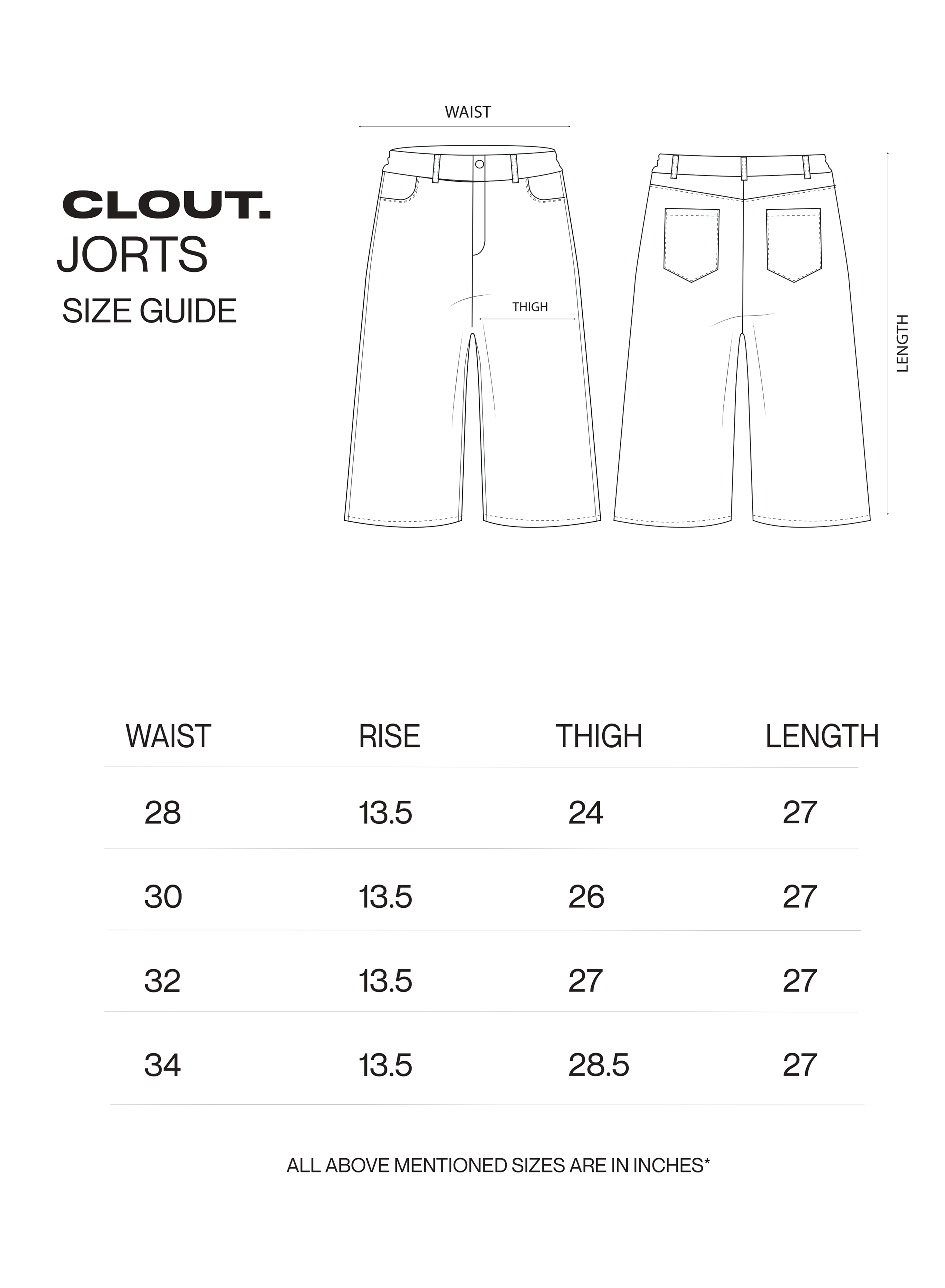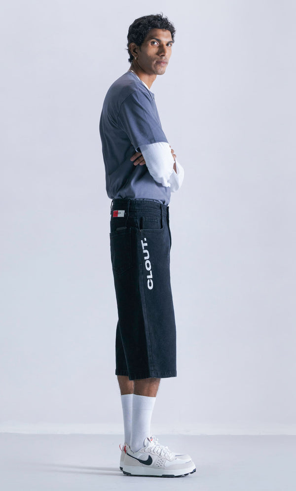 The signature vertical "CLOUT." branding stamped down the thigh channels unapologetic attitude, while a reinforced waistband, classic five-pocket construction, and raw hemline ensure durability and timeless appeal. Whether styled with oversized layers or minimal basics, these jorts are a versatile statement piece for contemporary wardrobes.