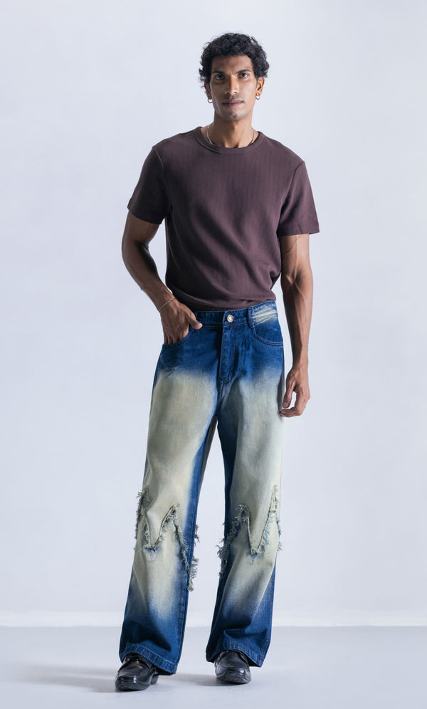 Crafted from premium cotton denim, the piece features a distinctive dual-tone gradient—fading from deep indigo to a weathered ivory. Frayed zigzag distressing along the thighs and knees adds textural depth without compromising sophistication.